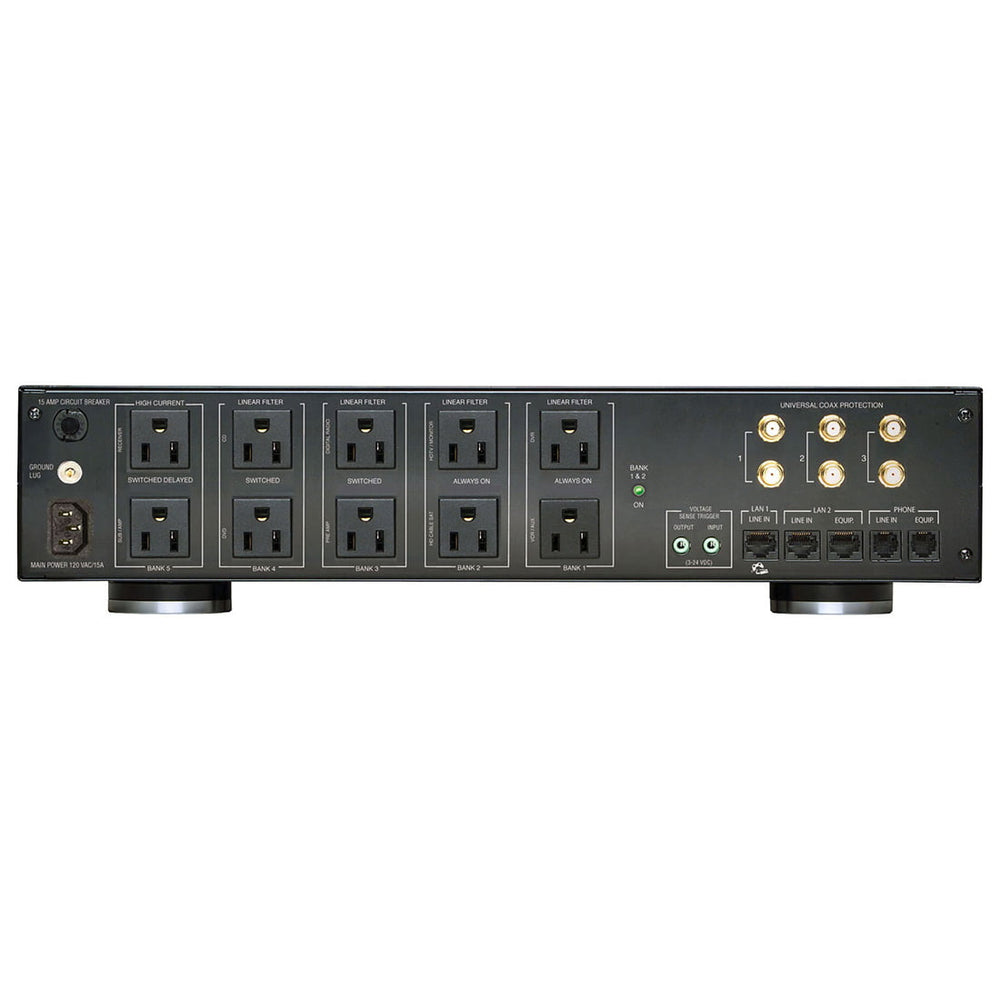 This power conditioner has ten AC outlets on its back panel, divided into five isolated banks to minimize cross-interference between your components. Two of the outlets accommodate high-current components, such as an amplifier and powered subwoofer. These switched outlets operate on a delay to prevent "speaker thump" when powering your system on and off. A front-panel digital voltmeter and ammeter let you closely monitor the AC power coming into your system.Ethernet and coaxial RF protection