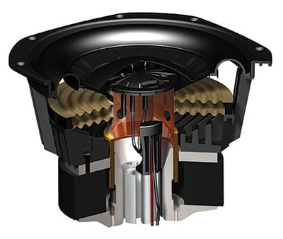 Overmolded NLC™ Non-Limiting Corrugated TPE Surrounds and Nomex® Cloth Spiders. These extreme low-density NLC™ surrounds on SUB 1 were FEA-optimized and overmolded onto the cones in house. Ten times more effective than standard thermoplastic elastomers in damping vibrations and resonances, the corrugated material works in tandem with our Vibration-Canceling Design Architecture to ensure not a hint of distortion exists, even at peak-to-peak excursion (almost 2" / 50 mm in SUB 2!) and full-on output.