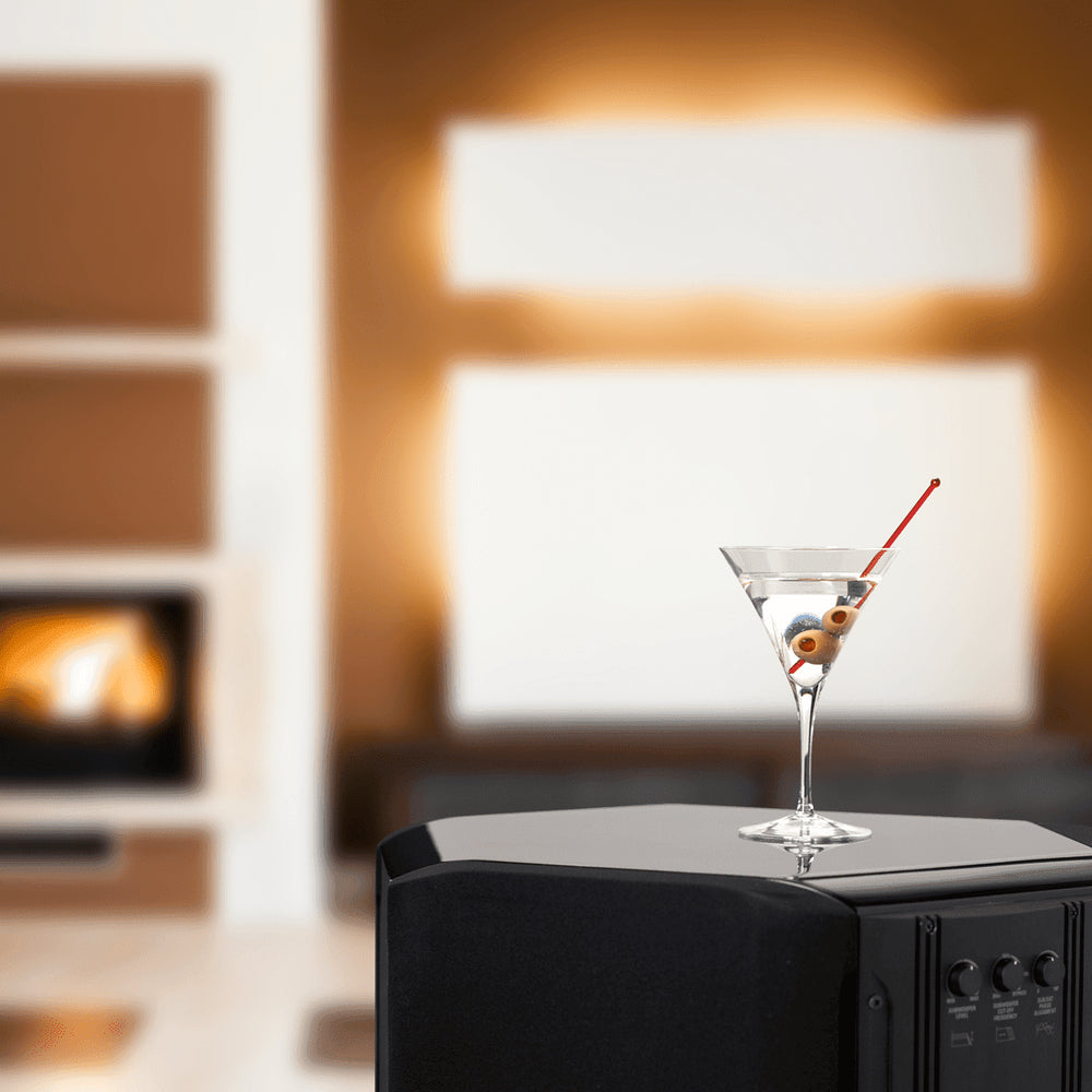 Subwoofer enclosures usually have one large driver. The cabinet can vibrate as the driver moves back and forth, resulting in a smeared response and bass that lacks clarity and definition. Inside the enclosure, well-executed cabinet design, such as that found on Paradigm Reference subwoofers, typically includes sophisticated and extensive physical bracing. So why does a martini set on top of the subs barely elicit a ripple when Paradigm puts six drivers in a single cabinet without significant physical bracing? SUB 2 are movers, not shakers, and were designed, engineered, and manufactured in North America by Paradigm... Massive airflow, massive output, and virtually no vibration. Inside the cabinet, six identical, perfectly balanced state-of-the-art drivers are radially aligned (two on each side). The powerful vibration-reaction forces (see arrows in diagram below) effectively cancel each other out as opposing forces of equal magnitude. Because unwanted, distortion-inducing vibrations are reduced to such a low level, barely a ripple disturbs the martini placed on top of the cabinet.