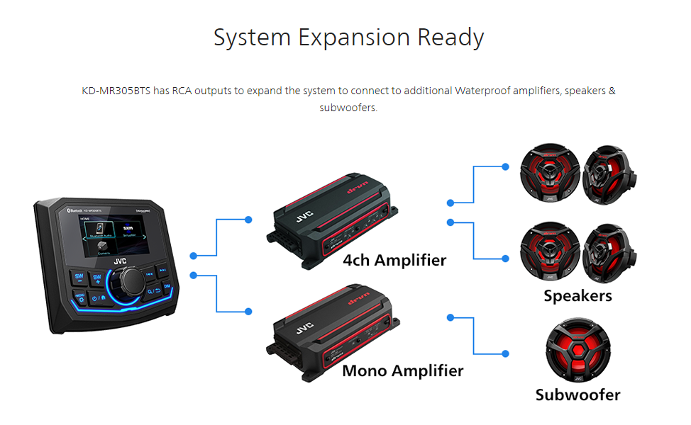 The KD-MR305BTS offers versatile system expansion options to enhance your onboard audio setup. With two sets of preamp outputs, including a switchable sub output, you have the flexibility to connect additional amplifiers, speakers, and subwoofers for a customized sound system tailored to your preferences. Plus, the rear-view camera input allows for easy installation of an optional camera for added safety while driving.