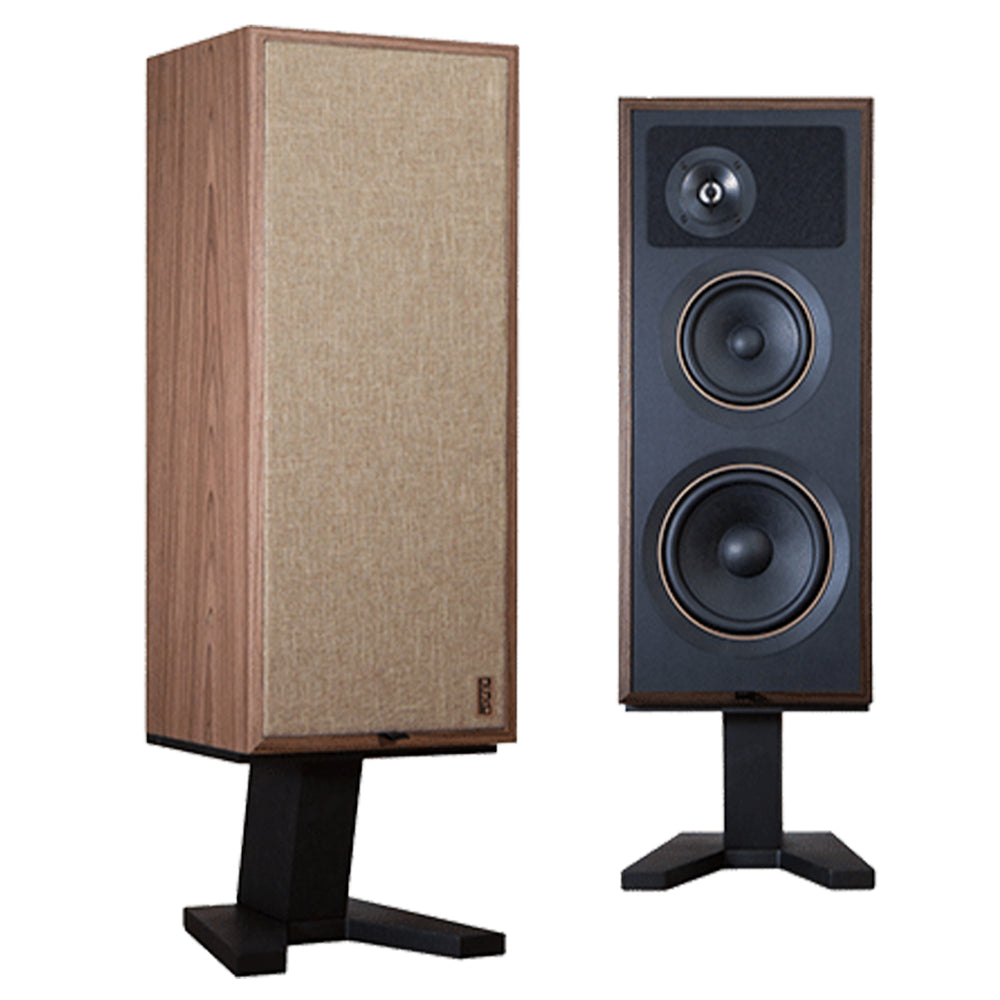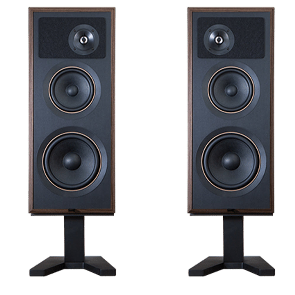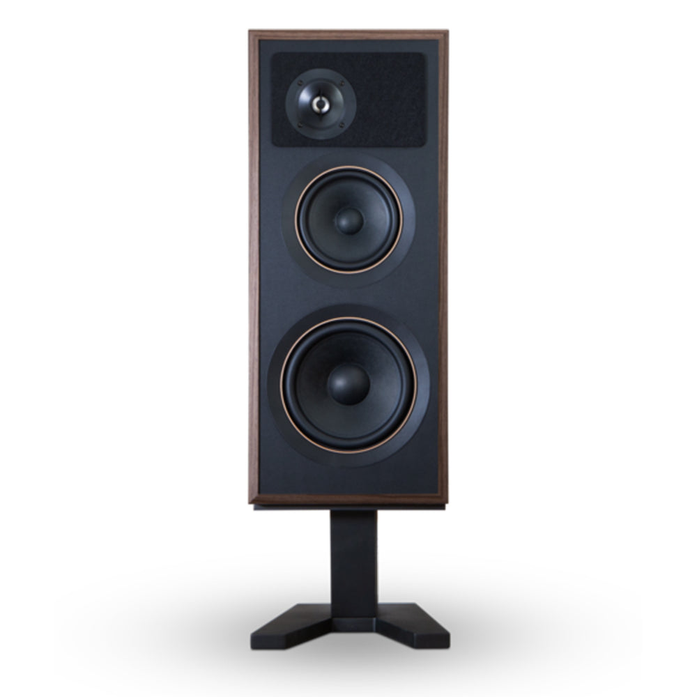 - Retro-styled open-grained walnut veneer enclosure and dedicated speaker stands