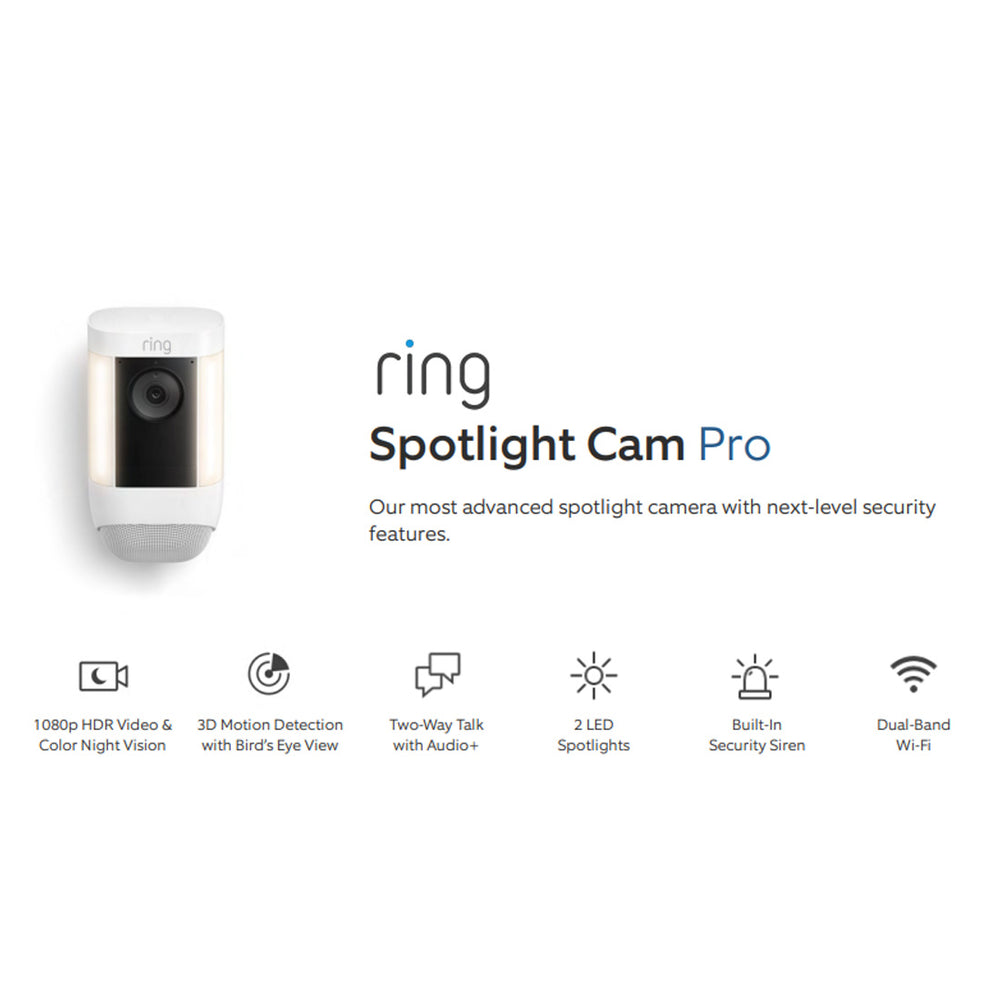 Ring Spotlight Cam Plus includes Live View, Two-Way Talk, Advanced Motion Detection, Customizable Motion Zones, Customizable Privacy Settings, Color Night Vision, and the Ring app. Ring Spotlight Cam Pro builds on these features with a redesigned camera and advanced upgrades including radar-powered 3D Motion Detection, Bird’s Eye View, Audio+ for enhanced sound quality, HDR video, and dual-band Wi-Fi.
