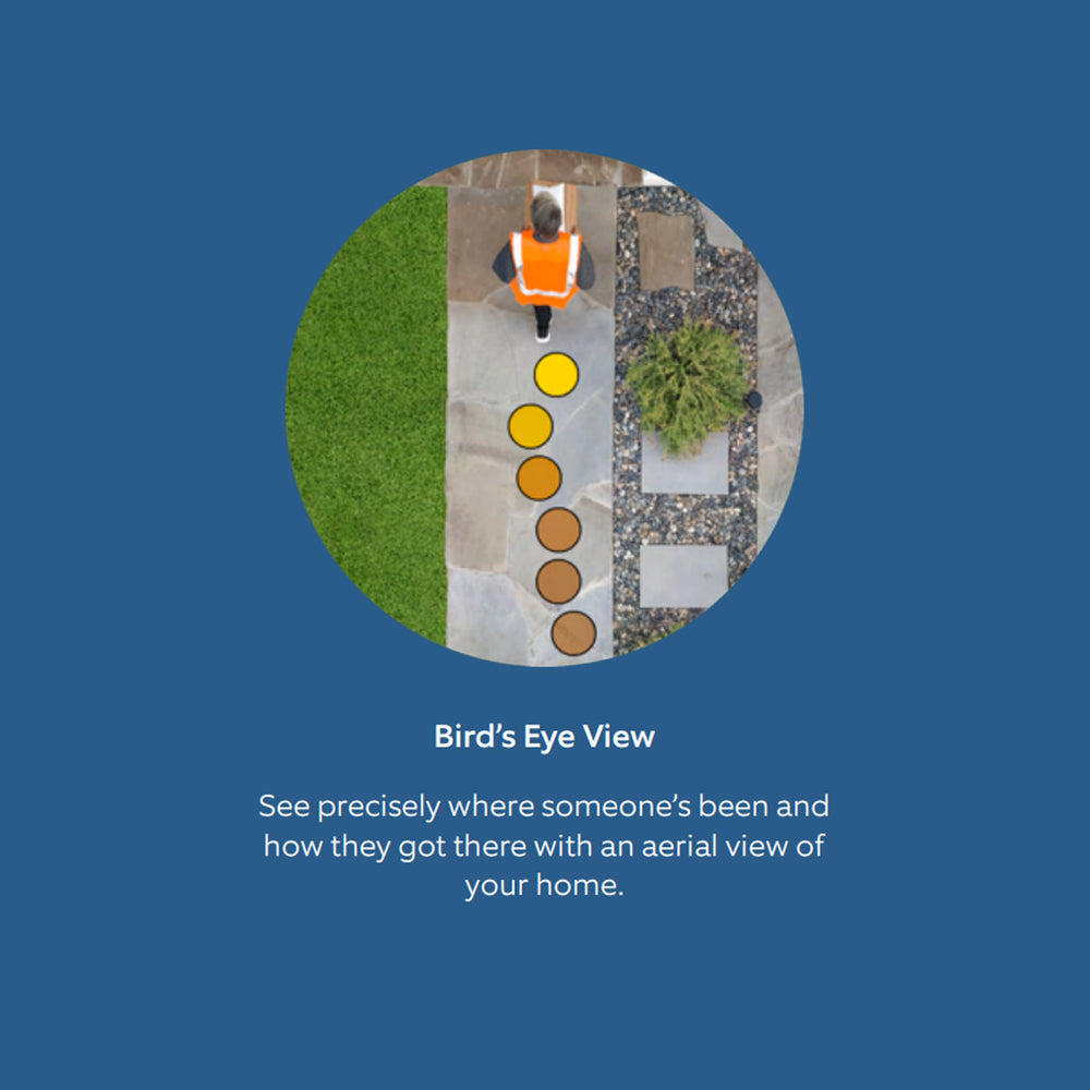 In the Ring App, you can customize exactly where on your property the camera should begin recording when an object crosses a defined threshold. Once enabled, 3D Motion Detection powers Bird’s Eye View, which provides an aerial map showing motion paths and clearly illustrates how visitors move through your property.