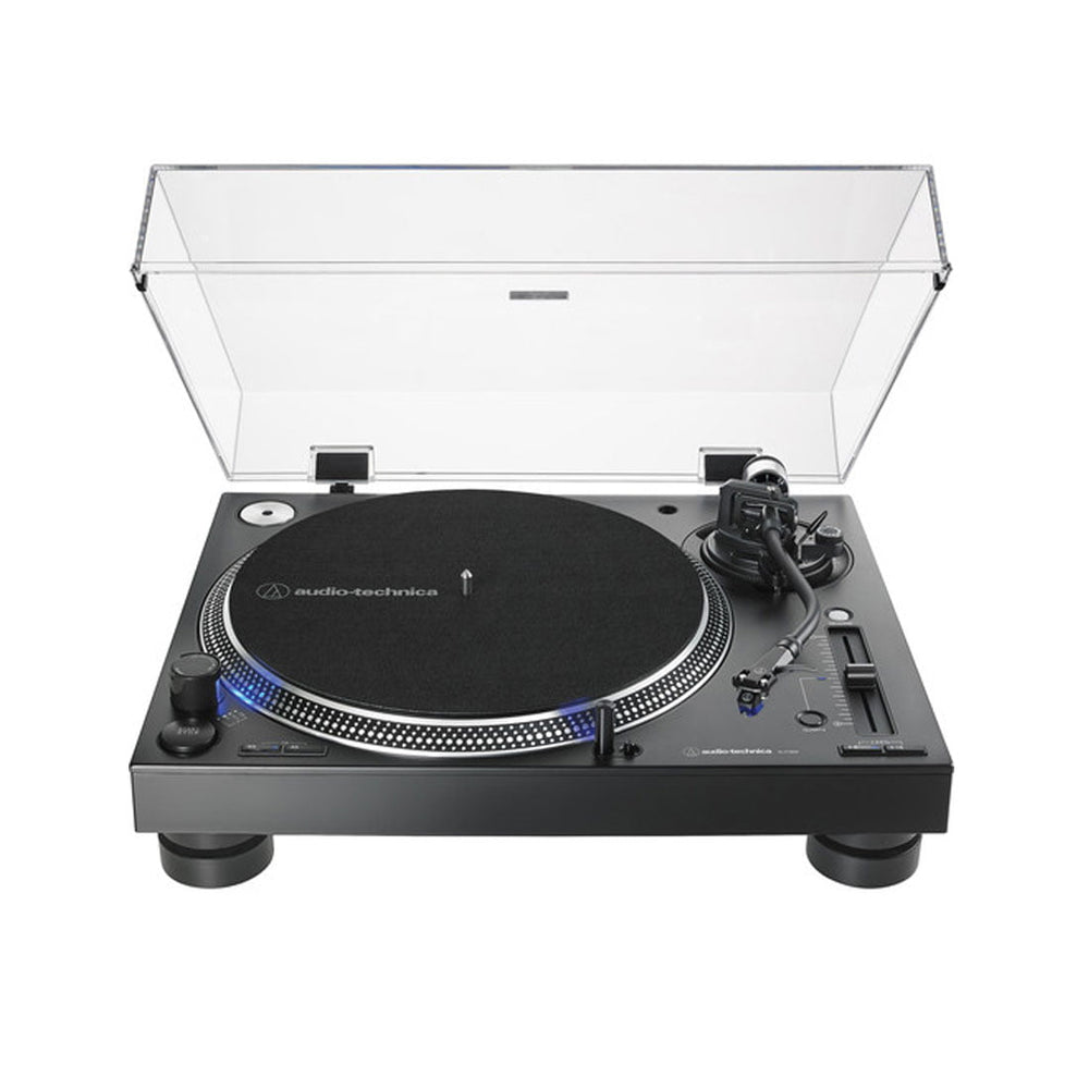 The AT-LP140XP fully manual professional DJ turntable features a high-torque direct-drive motor and anti-resonant, mass-damped, die-cast aluminum platter to ensure stable, on-axis rotation at 33-1/3, 45, and 78 RPM. It is equipped with an S-shaped tonearm with height adjustment, adjustable tracking force (counterweight) and adjustable dynamic anti-skate control.