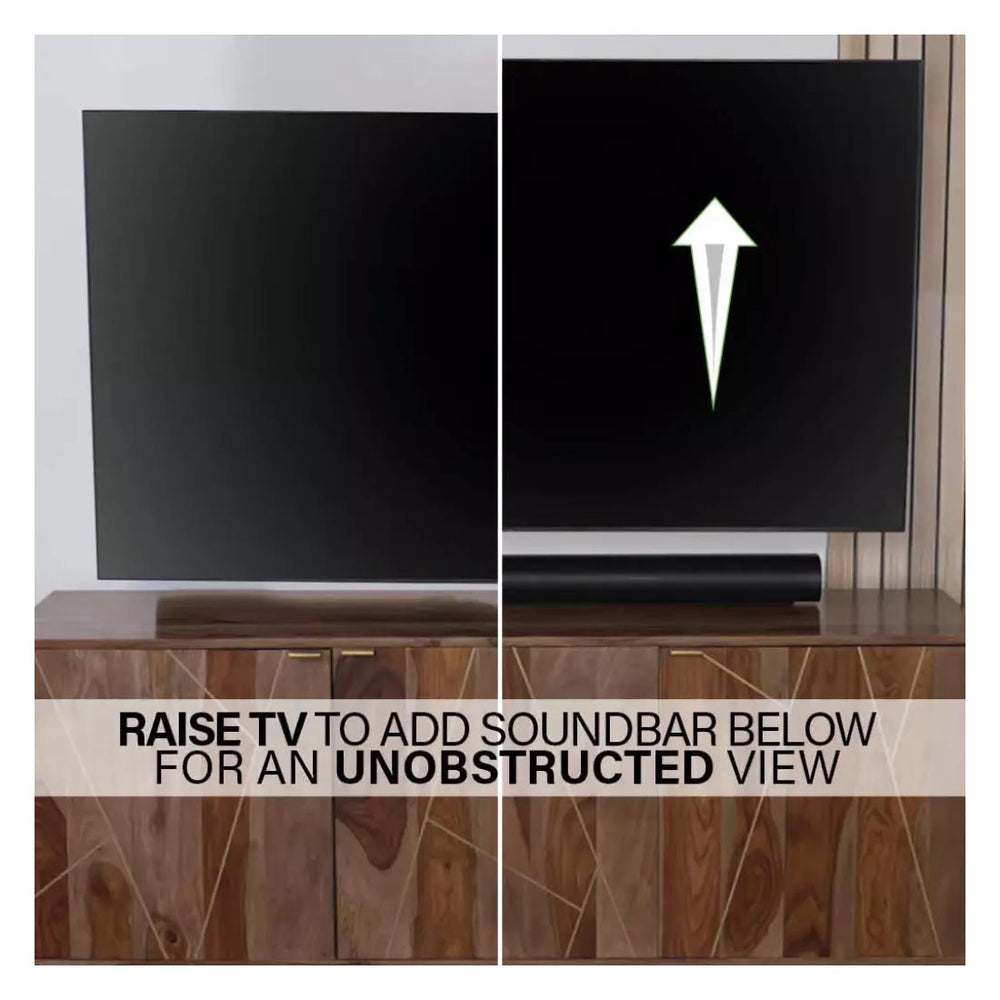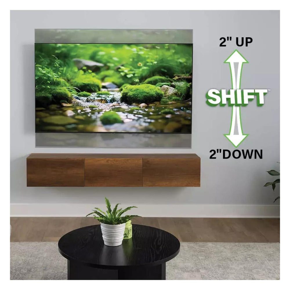 The Shift mechanism adds up to 4 inches of vertical travel long after the lag bolts are sunk. A drop-down handle hides neatly behind the screen; pull it, raise or lower the display, then release it to lock the position. This extra adjustability is helpful when wall plates, mantels, or an unexpected mis-measurement threaten to block the perfect sight line.