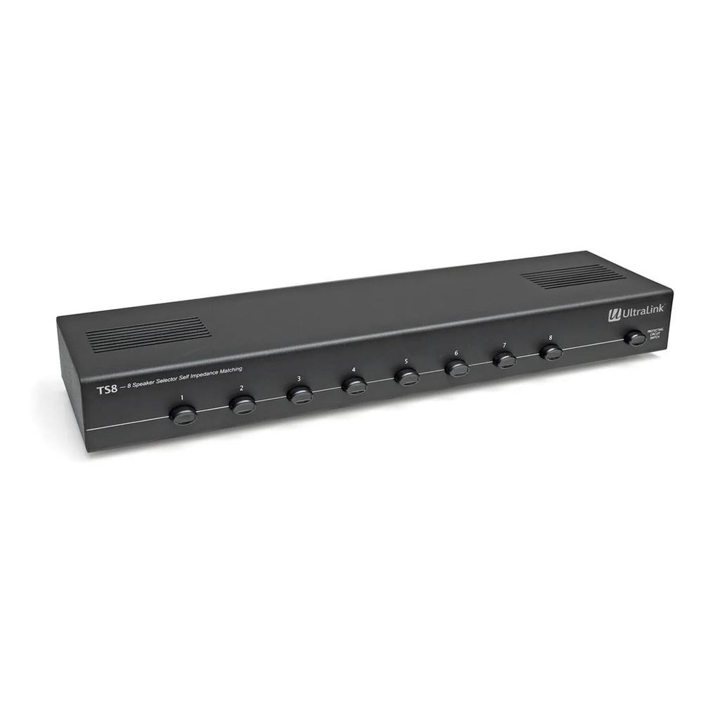 The Ultralink TS8 is a 1-source, 8-zone speaker selector that expands an audio system into a complex multi-room sound system. It distributes audio to speakers in different zones with independent zone control.