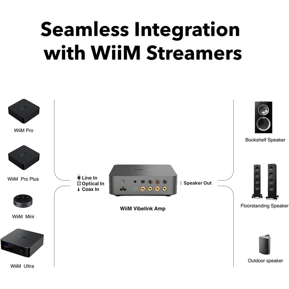 Designed to work flawlessly with the WiiM Mini, Pro, Pro Plus, and Ultra, the Vibelink Amp provides plug-and-play compatibility, ultra-low latency, and perfectly synced playback for a cohesive home audio experience.