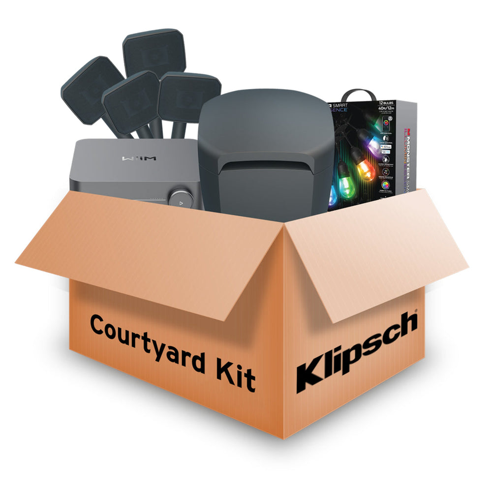 The Klipsch Courtyard Speaker Kit combines a 4.1 Landscape Speaker System with a WiiM streaming amp and Monster Bistro+ string lights to create a cohesive solution for patios, decks, and gardens. The Klipsch Courtyard 4.1 Landscape Speaker System delivers horn-loaded outdoor sound, while the WiiM Amp adds streaming and control, and the Monster string lights provide smart, weather-resistant lighting for outdoor spaces.