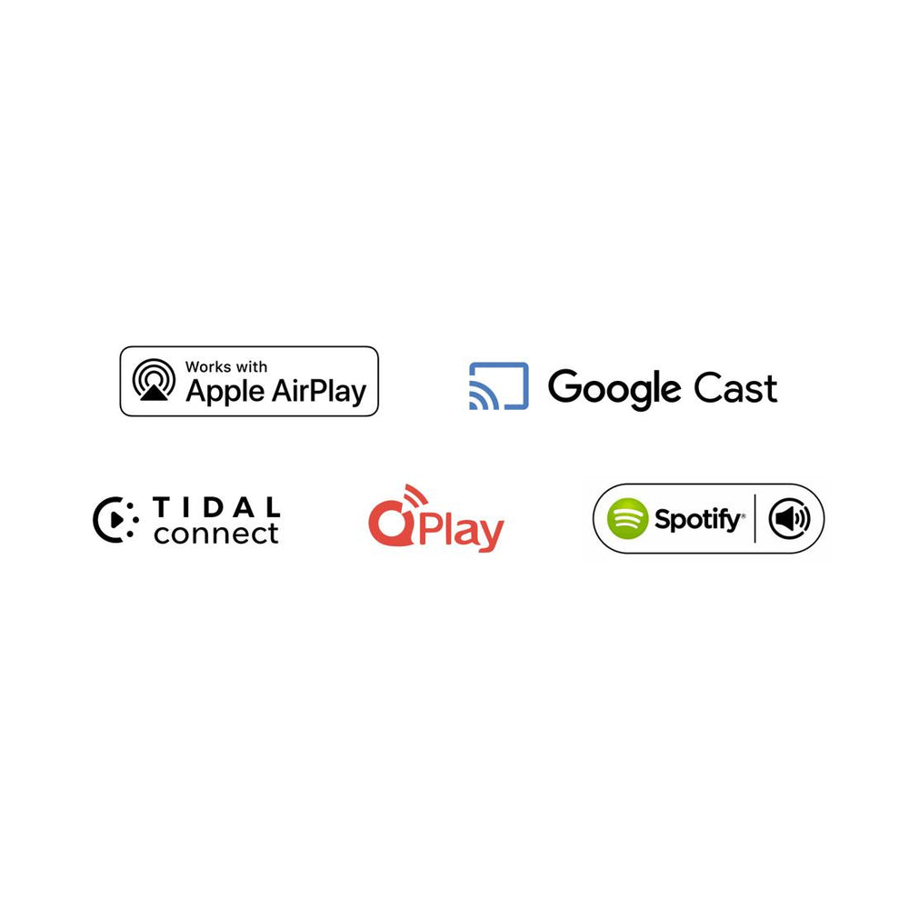 - Apple AirPlay, Google Cast, Spotify Connect, and Tidal Connect supported