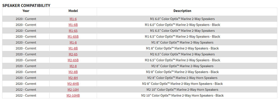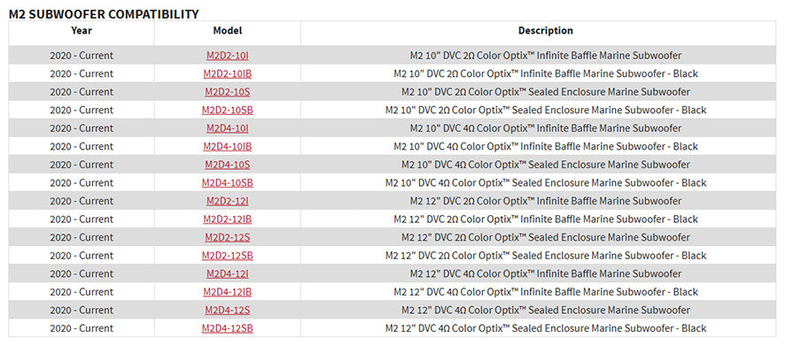 - Which speakers and subwoofers is it compatible with? It is compatible with Rockford Fosgate M1 and M2 Color Optix™ speakers and subwoofers. Check the compatibility chart below before purchasing.