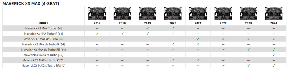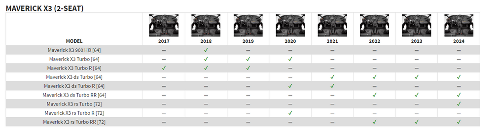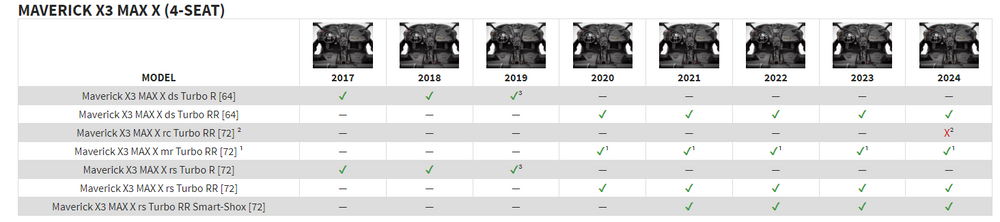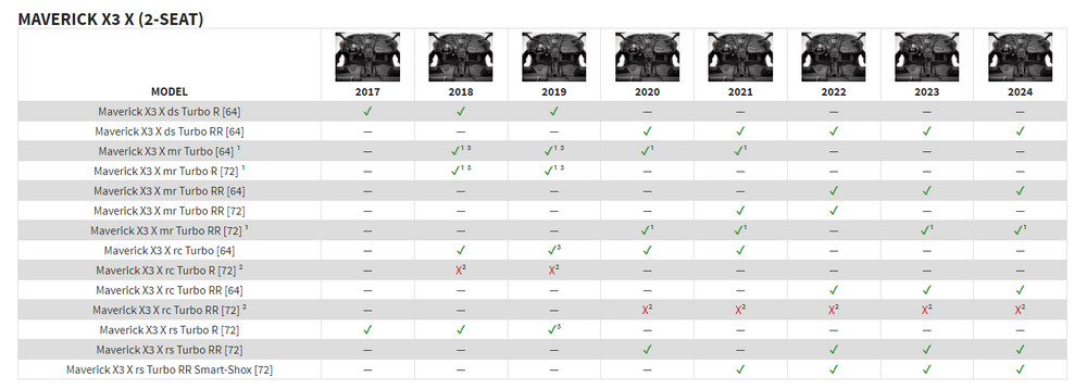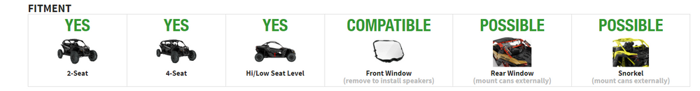 Charts contain newer naming convention — started in 2022 — featuring 64" and 72" width models. Older models denote [width] in name to clarify make/model/year progression. 1 Snorkel prevents stages with rear moto-cans from being installed inside roll-cage, must be installed outside roll-cage. 2 Intrusion Bar introduced in 2018, causes (FSE) front speaker clearance issue. 3 Smart-Lok™ introduced in 2018, requires 2nd (RFX317-FSE) or 3rd generation (X317-FSE) front speaker panels.